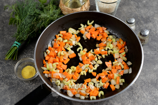 В то же время разогрейте немного постного рафинированного масла в сковороде, выложите в него нарезанный мелко репчатый лук, морковь и стебли сельдерея. Обжарьте до мягкости минуты 3-4.