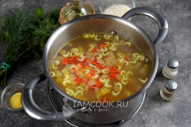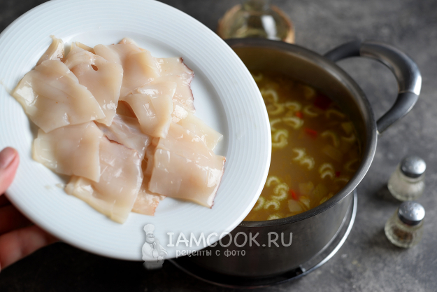Кальмара нарежьте кусочками шириной 3-4 сантиметра, добавьте в суп. Долейте воды до верха кастрюли, посолите и поперчите суп по вкусу, всыпьте универсальную приправу. Я сделала на тушке кальмара насечки острым ножом, за счет этого во время приготовления он свернется и будет очень симпатично выглядеть в готовом виде.
