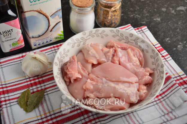 Подготовьте все необходимые продукты для Адобо из курицы. Курицу нужно помыть, обрезать все лишнее (хрящики, жир).
