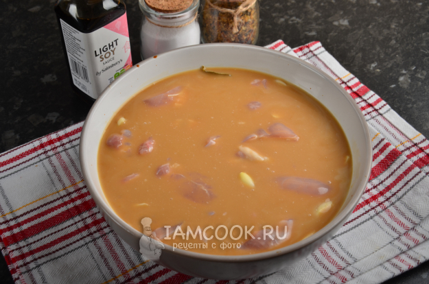 Так как соевого соуса совсем мало на такое количество курицы и маринада в целом, то лучше дополнительно добавить соль. Специи добавьте по вкусу и по желанию.