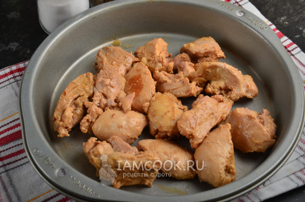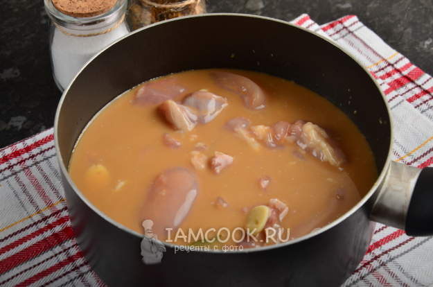 Маринуйте курицу несколько часов, затем перелейте ее вместе с маринадом в кастрюлю. Тушите на слабом огне в течение 25-30 минут.