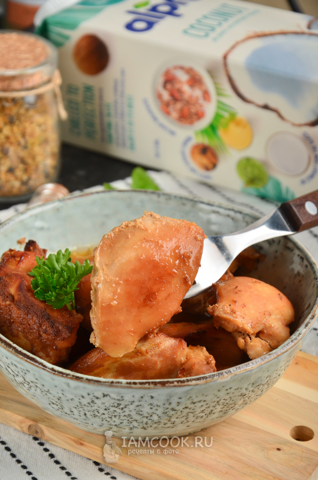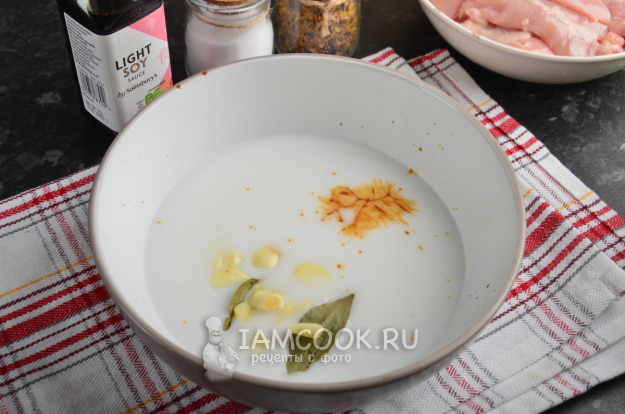 В глубокой миске нужно приготовить кокосовый маринад - влейте кокосовое молоко, добавьте соевый соус. Зубчики чеснока очистите от шелухи и нарежьте пластинками, положите в миску вместе с лавровым листом. Все хорошенько перемешайте.