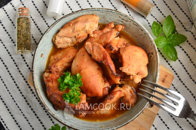 Тушеную курицу достаньте из соуса и переложите в форму для запекания. Поставьте в разогретую до 180 градусов духовку на 10 минут. Оставшийся соус можно немного уварить, чтобы стал гуще, а затем использовать при подаче.