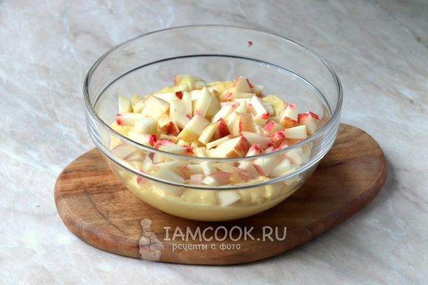 Удалите из нектарина косточку, а мякоть нарежьте небольшими кубиками. Фруктовую нарезку отправьте в миску с тестом и снова перемешайте.