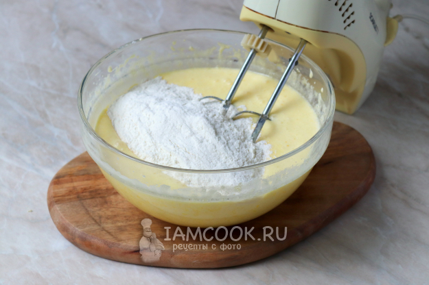 Введите подготовленную пшеничную муку и разрыхлитель.