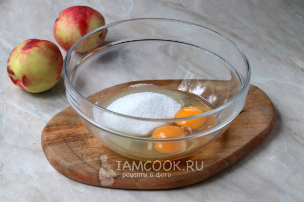 В глубокой миске соедините куриные яйца и сахарный песок.