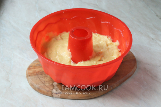 Выложите тесто в форму для кекса, оно должно заполнять её на 2/3 объема. Если у вас форма металлическая или керамическая, лучше застелите её пергаментом или смажьте тонким слоем сливочного масла. В моём случае - силиконовая, поэтому я ничем её не обрабатывала.