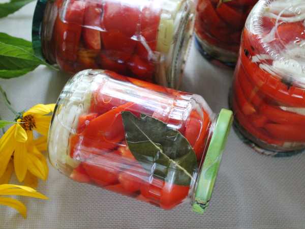И доверху наполняем баночки помидорами, сверху укладываем слой лука и лаврушку.