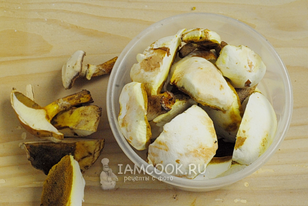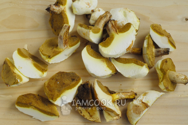 Крупные грибы разрежем, мелкие можно оставить целыми. Мякоть шляпок имеет желтоватый цвет, что делает нарезанные грибы похожими на яблоки.