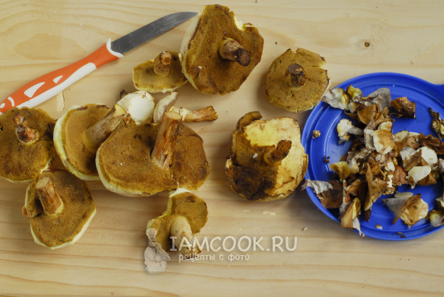 Почистим маслята: с ножек снимем грязь и лесной мусор. Со шляпок снимем кожицу, она снимается легко ножом. Проверим грибы на наличие червей: червивые грибы нам ни к чему.