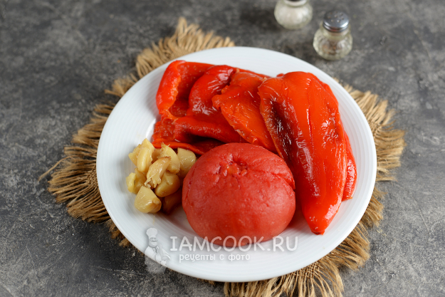 Когда овощи будут готовы, почистите перец от семечек и плодоножки, снимите с него и с помидора кожицу. Чеснок также нужно очистить от шелухи.