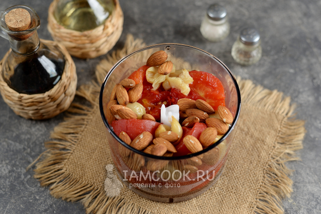 Пробейте содержимое до однородного состояния - в этом случае в соусе будут попадаться маленькие кусочки орехов. Если же хотите совсем однородное состояние, тогда пробейте содержимое погружным блендером.
