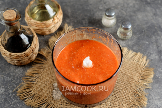 Нарежьте овощи крупными кусками, сложите в чашу блендера. Добавьте острый и черный перцы, соль по вкусу, влейте уксус и оливковое масло хорошего качества.