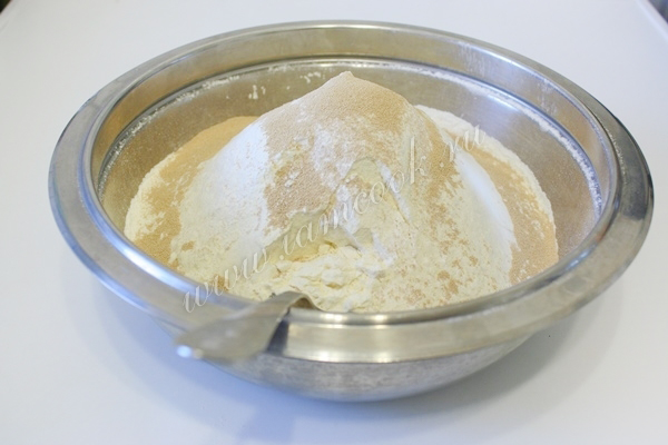 Всыпьте в муку сухие дрожжи и тщательно перемешайте.