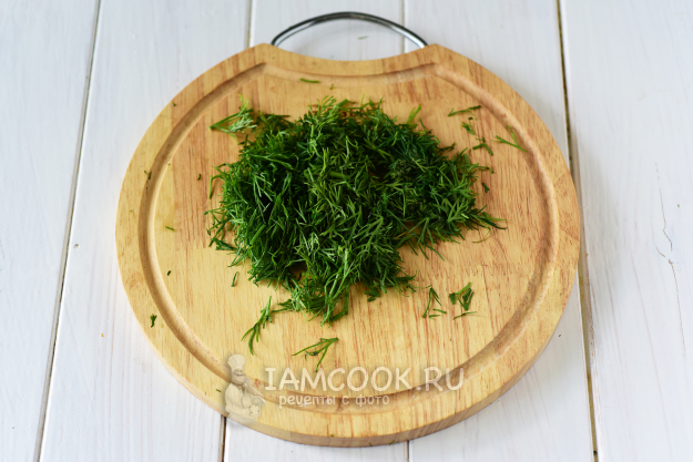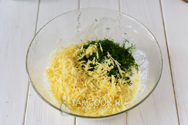 Добавить укроп и крупно натертый сыр в сметанную смесь. Перемешать.