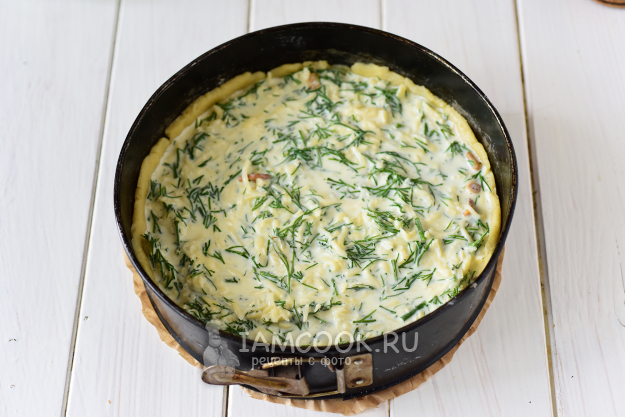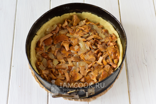 Соберем пирог. Выложить грибную начинку на основу из теста, равномерно распределяя.
