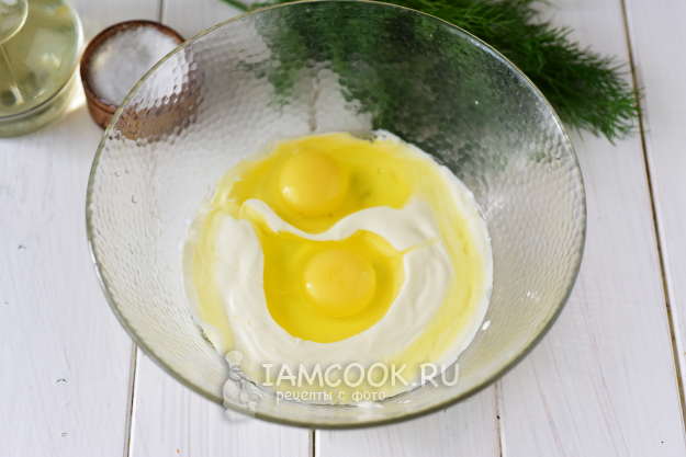 Займемся заливкой. В миску выложить сметану, вбить яйца, добавить соль. Перемешать ингредиенты венчиком до состояния однородной смеси.
