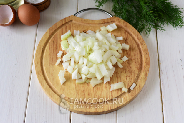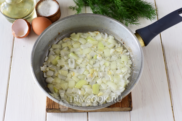 В сковороде разогреть растительное масло на среднем огне, выложить измельченный лук, обжарить до мягкости (4-5 минут).