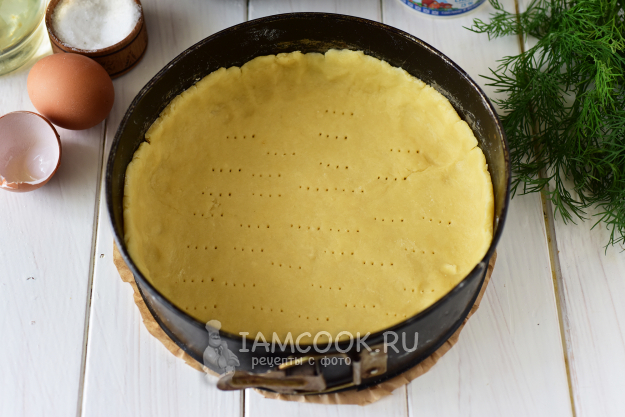 Дно разъемной формы застелить пергаментом для выпекания, выложить тесто, формируя основу будущего пирога с бортиками (высота - 3-4 см), наколоть тесто вилкой. На время отставить форму с основой в сторону.