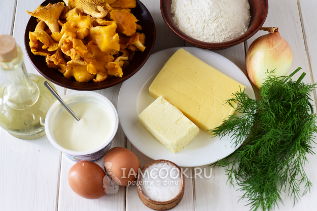 Подготовить ингредиенты для киша с лисичками. Вымыть лисички, очистить лук, ополоснуть укроп.