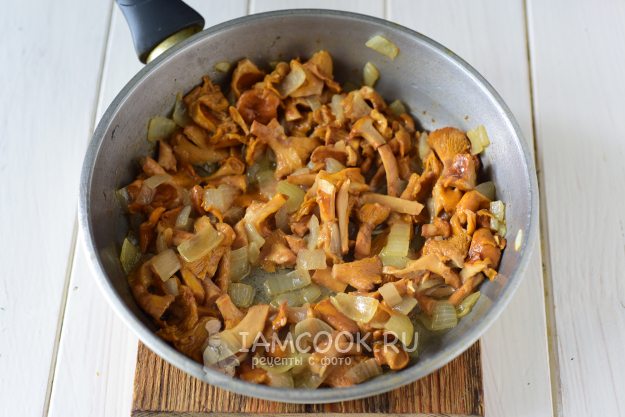 Добавить к луку лисички, порезав на несколько частей крупные экземпляры. Жарить все вместе до готовности лисичек, примерно еще 15 минут.