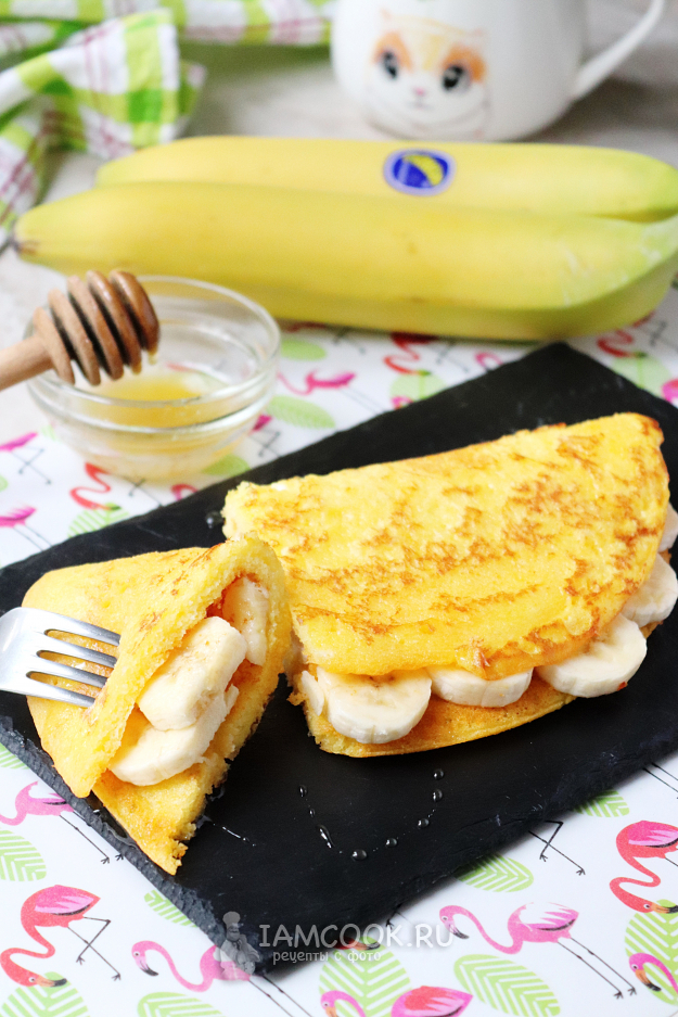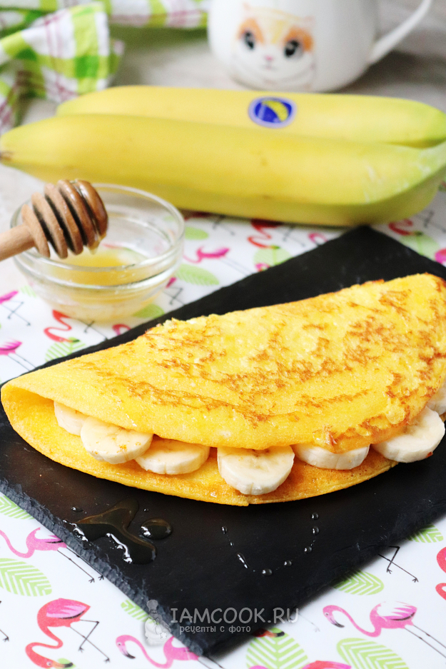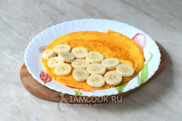 Готовый блин переложите на плоскую тарелку. По желанию его можно подать с начинкой на ваш вкус. В моём случае - банан и мёд. Банан очистите и нарежьте кружочками, выложите их на одну половину блина и полейте немного мёдом, после чего накройте свободным краем так, чтобы начинка оказалась внутри.