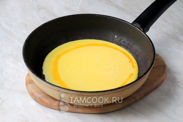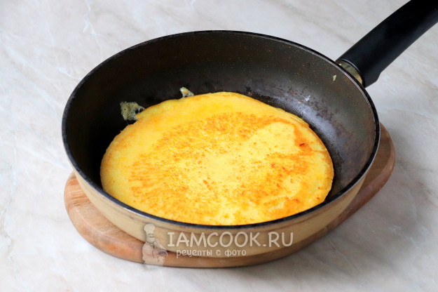 Сковороду с растительным маслом отправьте на огонь (если у вас сковорода с хорошим антипригарным покрытием - масло можно не использовать, достаточно будет того, что мы добавляли в тесто). Когда сковорода хорошо прогреется, вылейте тесто и распределите его по всему дну, сформировав круглую заготовку.
