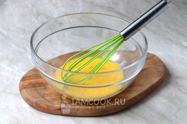 В глубокой миске соедините куриное яйцо, щепотку соли, молоко и растительное масло. Венчиком перемешайте массу до однородного состояния.