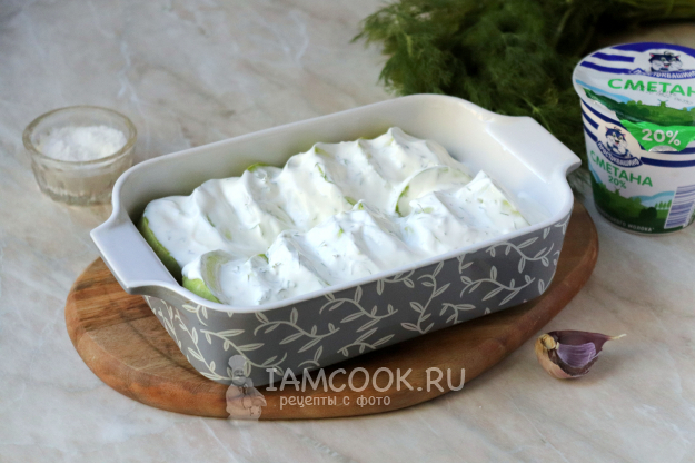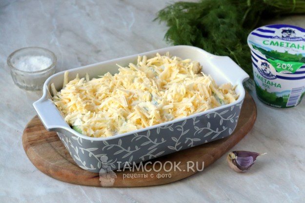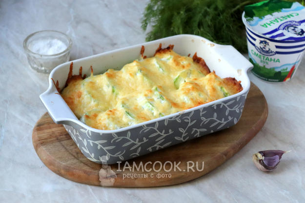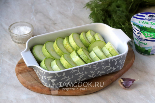 Нарезанные кабачки выложите в жаропрочную форму. Кружочки должны ложиться внахлёст друг на друга (как на фото).