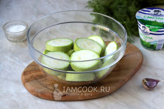 Кабачок тщательно помойте под холодной проточной водой, обсушите и нарежьте кружочками шириной около 1-1,5 см. Выложите их в миску и немного посолите (учитывая, что в рецепте будет использоваться сыр, который уже имеет солоноватый вкус).