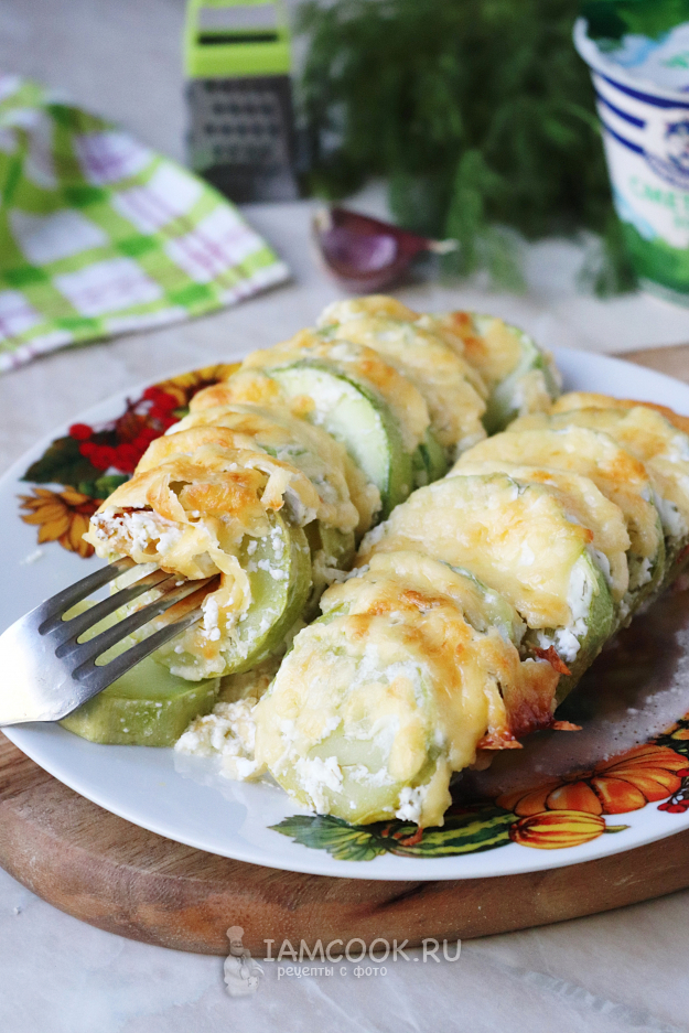 Форму с кабачками отправьте в разогретую до 180 градусов духовку на 30 минут. За 5 минут до готовности включите верхний нагрев, чтобы блюдо приобрело золотистую корочку.