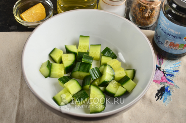 Свежий огурец нарежьте крупными кубиками и сложите в глубокий салатник.