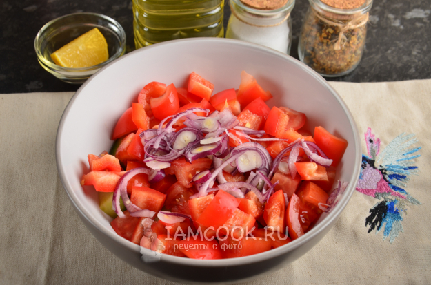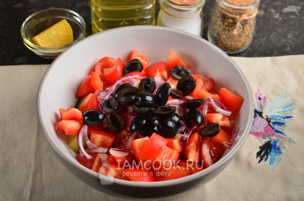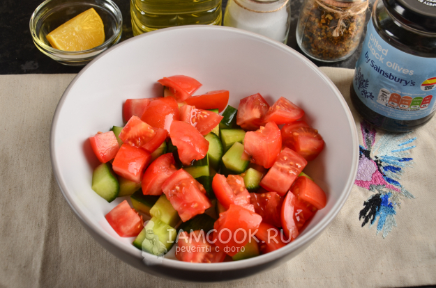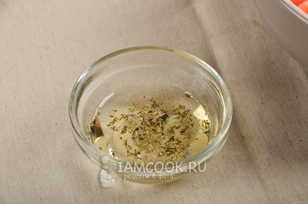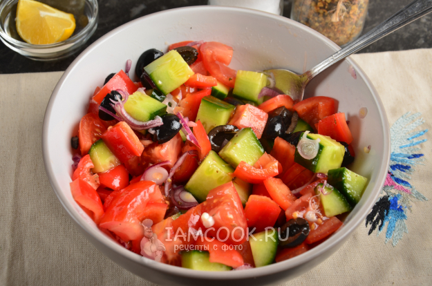 Сделайте заправку для греческого салата - налейте в пиалу оливковое масло, добавьте лимонный сок, специи, можно по желанию всыпать щепотку сушеных ароматных трав, все перемешайте.