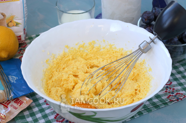 Разделить яйца на белки и желтки. Белки отложить в сторону, а желтки по одному вводить в масляную смесь, продолжая взбивать.