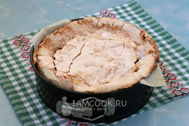 Минут за 15 до окончания выпекания можно начинать взбивать меренгу. К белкам добавить щепотку соли и взбивать венчиком, пока масса не побелеет. Не переставая взбивать, добавить чайную ложку лимонного сока и постепенно небольшими порциями добавлять сахар или сахарную пудру (200 г). Взбивать меренгу до стойкой пышной массы 10 минут. Вынуть пирог из духовки, покрыть его меренгой, увеличить температуру духовки до 200 градусов и печь ещё 25-30 минут. Пирог вынуть и остудить в форме.