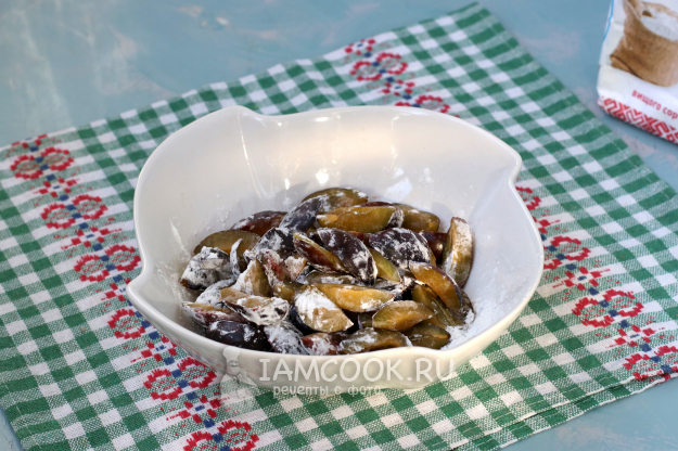 Сливы вымыть и протереть сухим полотенцем. Разрезать на 4 части, удалить косточки. Посыпать сливы крахмалом и перемешать.
