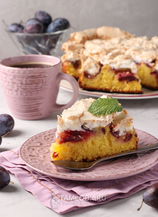 Аккуратно извлечь остывший сливовый пирог с меренгой из формы, переложить на блюдо и разрезать на порции. Наливать чай или кофе и наслаждаться вкуснейшим пирогом.