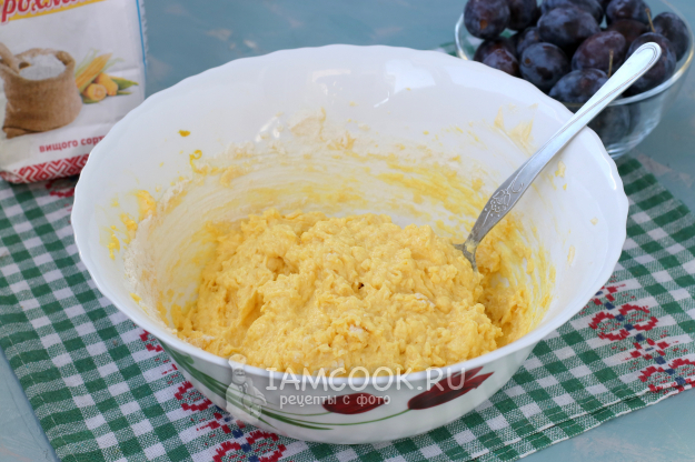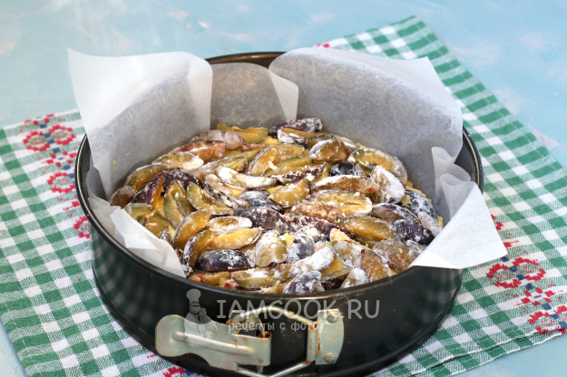 Форму застелить пергаментом, вылить тесто, разровнять. Сверху выложить сливы. Духовку разогреть до 180 градусов, и выпекать основу 30 минут.