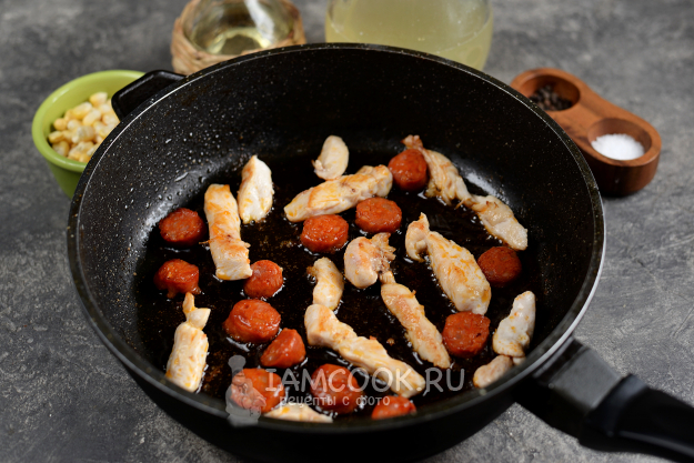 Разогрейте в сковороде немного растительного масла, выложите в него нарезанные колбаски и ломтики куриного филе. Обжарьте пару минут до золотистой корочки. Снимите мясные изделия на теплую тарелку.