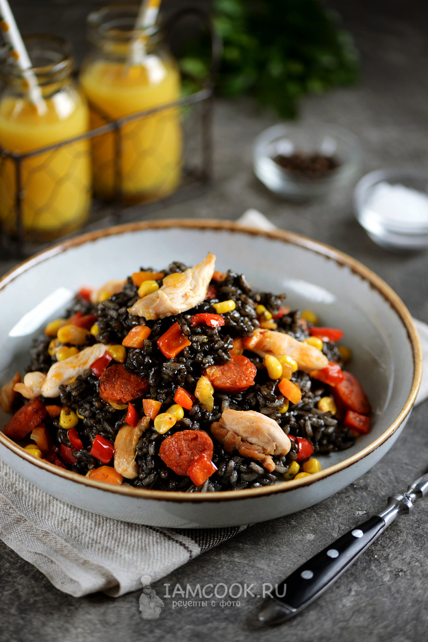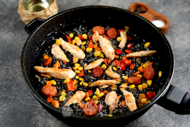 Сверху на почти готовый рис выложите куски курицы и колбаски, обжаренные овощи. Слегка посолите и поперчите. Накройте сковороду крышкой и оставьте на самом тихом огне на 5-7 минут. За это время бульон практически полностью выкипит, а рис пропитается вкусами и ароматами мяса с овощами. Перемешивать черную паэлью уже ни в коем случае не рекомендуется, поскольку чернила моментально покрасят все продукты в черно-синий цвет и блюдо будет выглядеть очень неаппетитно, хотя на самом деле будет невероятно вкусным.