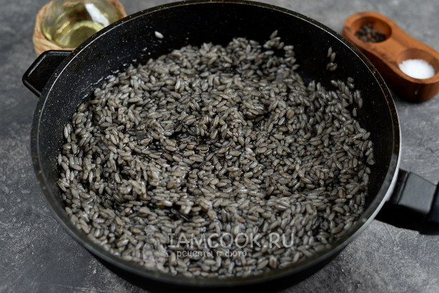 Попробуйте рисинку на вкус, она должна быть "аль-денте". На этом этапе можно добавить чернила каракатицы. Сначала пойдет сильный рыбный запах, но пусть вас это не пугает, он моментально улетучится и никакого привкуса от рыбы не останется. Советую начинать с одного стандартного пакетика, это 4 грамма, как правило, и рис будет такого цвета, как на фото. Я на это количество крупы кладу 8 граммов, рис получается красивого черного цвета. Теперь рис можно посолить и поперчить.