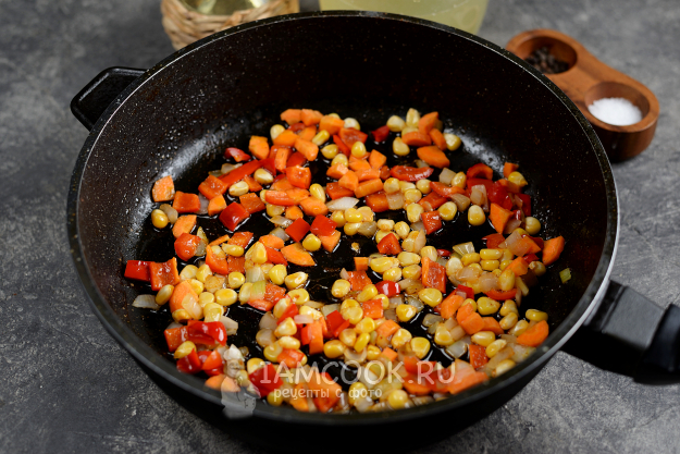 В это же масло положите нарезанные мелким кубиком болгарский перец и репчатый лук, добавьте кукурузу. Жарьте на умеренном огне минут 5. Овощи также нужно снять со сковороды.