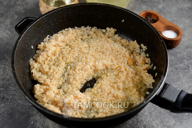 Теперь всыпьте промытый рис, дайте ему впитать ароматное масло и начинайте понемногу подливать бульон. Готовится рис также на умеренном или даже тихом огне минут 15-20.