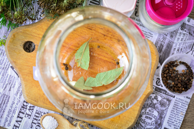 В подготовленную банку сложите специи - перец горошком, лавровый листик и почищенный зубчик чеснока.