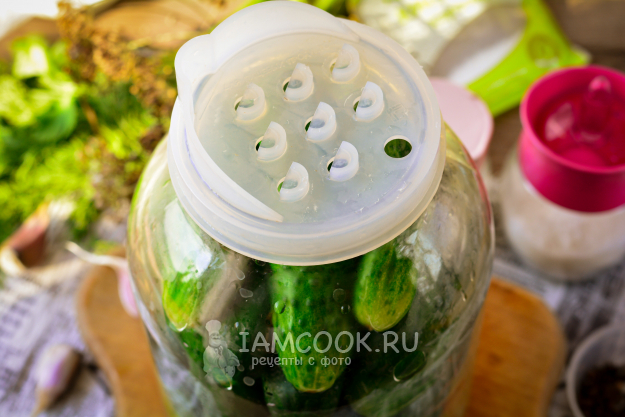 Слейте воду с огурцов в раковину, закрыв банку специальной крышкой с дырочками.