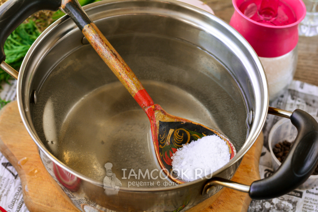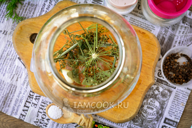 Добавьте зонтики укропа. Если он будет слегка подсушен - ничего страшного, такой укроп более ароматный. Также, кроме зонтиков, можете нарезать и немного веточек укропа - на рынке продают из него целые букеты для засолки.