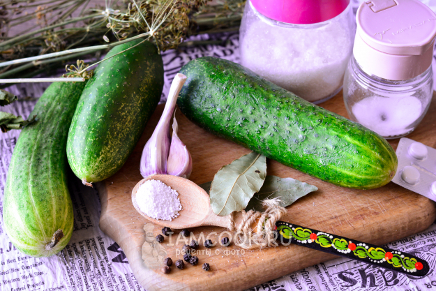 Подготовьте ингредиенты для приготовления огурцов с аспирином на зиму без стерилизации.