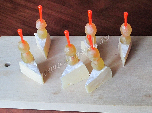 И тоже, сопроводив виноградинами, зафиксируйте шпажкой.