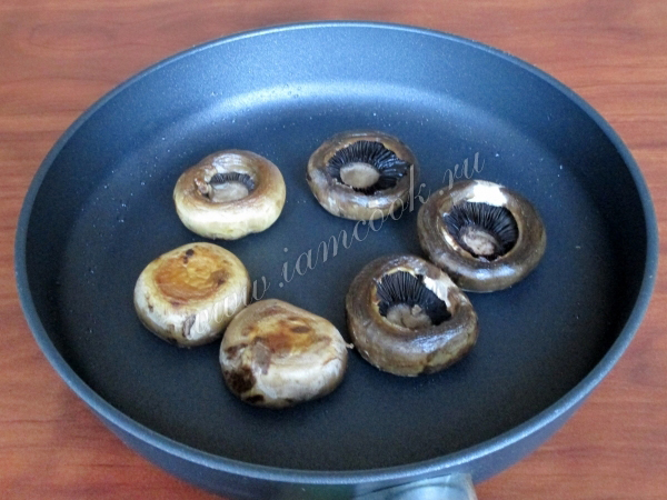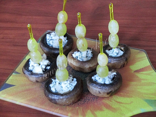 Прямо в теплые уложите порции сыра с голубой плесенью (Дор блю и т.п.) и сопроводите парочкой виноградин без косточек и зафиксируйте шпажкой.