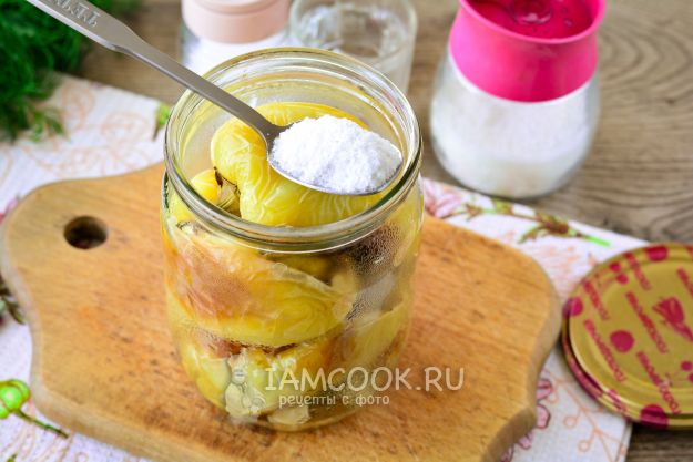 В оставшееся пространство в банке влейте крутой кипяток. Удобно сбоку перца вставить лезвие ножа и немного освободить место - воды больше поместится.